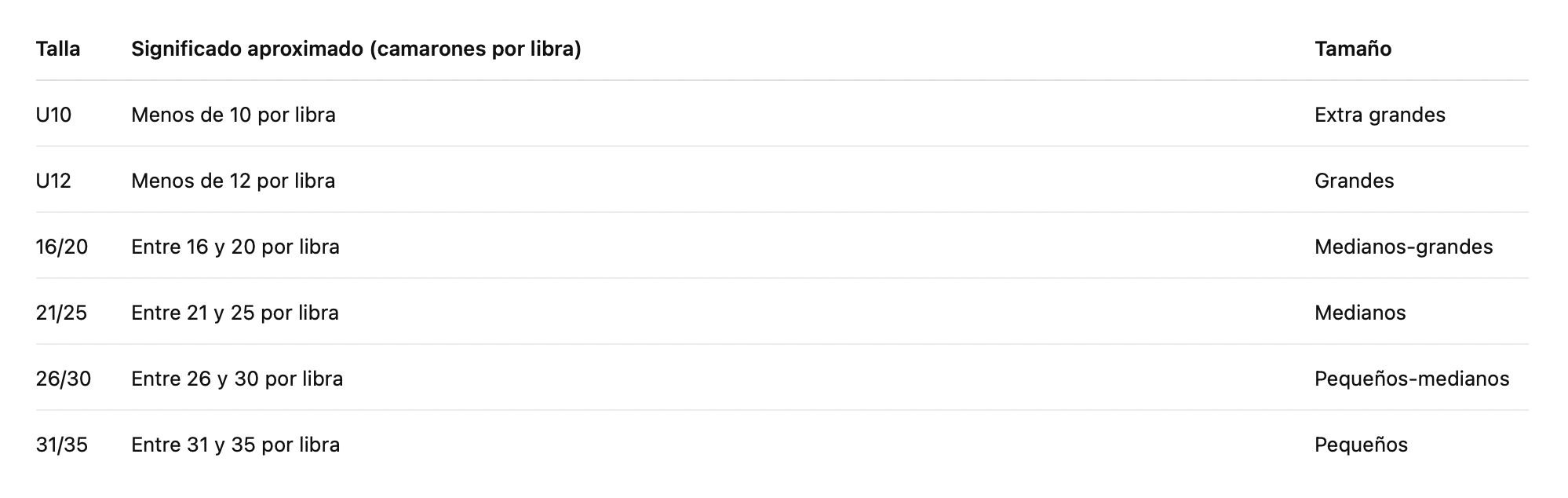 Mientras menor sea el número, más grandes son los camarones.